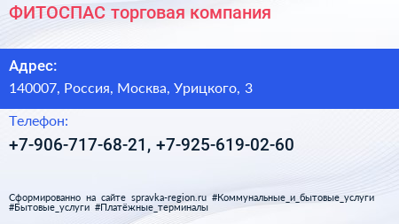 ФИТОСПАС, торговая компания по адресу 140007, Россия, Москва, Урицкого, 3 в дальнейшем Организация, размещена в следующих категориях: