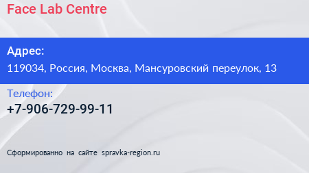 Face Lab Centre по адресу 119034, Россия, Москва, Мансуровский переулок, 13 в дальнейшем Организация, размещена в следующих категориях: