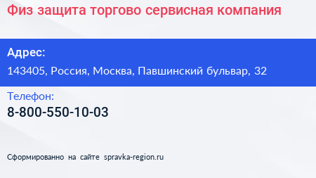 Физ-защита, торгово-сервисная компания по адресу 143405, Россия, Москва, Павшинский бульвар, 32 в дальнейшем Организация, размещена в следующих категориях: