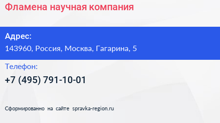 Фламена, научная компания по адресу 143960, Россия, Москва, Гагарина, 5 в дальнейшем Организация, размещена в следующих категориях: