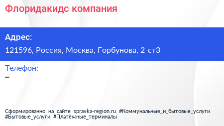 Флоридакидс, компания по адресу 121596, Россия, Москва, Горбунова, 2 ст3 в дальнейшем Организация, размещена в следующих категориях:
