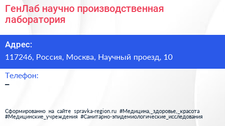 ГенЛаб, научно-производственная лаборатория по адресу 117246, Россия, Москва, Научный проезд, 10 в дальнейшем Организация, размещена в следующих категориях: