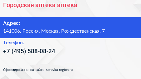 Городская аптека, аптека по адресу 141006, Россия, Москва, Рождественская, 7 в дальнейшем Организация, размещена в следующих категориях: