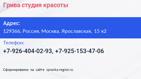 Грива, студия красоты по адресу 129366, Россия, Москва, Ярославская, 15 к2 в дальнейшем Организация, размещена в следующих категориях: