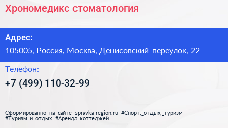 Хрономедикс, стоматология по адресу 105005, Россия, Москва, Денисовский переулок, 22 в дальнейшем Организация, размещена в следующих категориях: