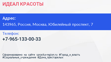 ИДЕАЛ КРАСОТЫ по адресу 143965, Россия, Москва, Юбилейный проспект, 7 в дальнейшем Организация, размещена в следующих категориях: