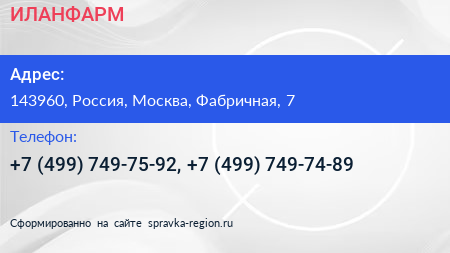 ИЛАНФАРМ по адресу 143960, Россия, Москва, Фабричная, 7 в дальнейшем Организация, размещена в следующих категориях: