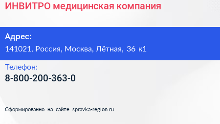 ИНВИТРО, медицинская компания по адресу 141021, Россия, Москва, Лётная, 36 к1 в дальнейшем Организация, размещена в следующих категориях: