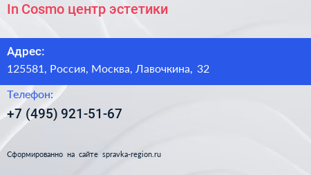 In-Cosmo, центр эстетики по адресу 125581, Россия, Москва, Лавочкина, 32 в дальнейшем Организация, размещена в следующих категориях: