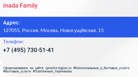 Inada Family по адресу 127055, Россия, Москва, Новосущёвская, 15 в дальнейшем Организация, размещена в следующих категориях: