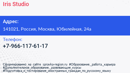 Iris Studio по адресу 141021, Россия, Москва, Юбилейная, 24а в дальнейшем Организация, размещена в следующих категориях: