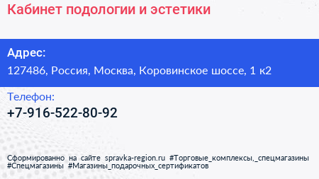 Кабинет подологии и эстетики по адресу 127486, Россия, Москва, Коровинское шоссе, 1 к2 в дальнейшем Организация, размещена в следующих категориях: