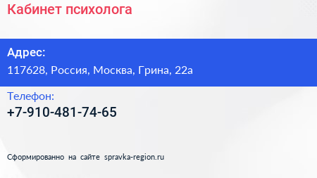 Кабинет психолога по адресу 117628, Россия, Москва, Грина, 22а в дальнейшем Организация, размещена в следующих категориях: