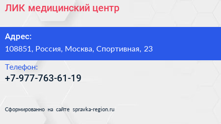 ЛИК, медицинский центр по адресу 108851, Россия, Москва, Спортивная, 23 в дальнейшем Организация, размещена в следующих категориях: