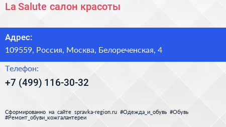 La Salute, салон красоты по адресу 109559, Россия, Москва, Белореченская, 4 в дальнейшем Организация, размещена в следующих категориях: