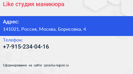Like, студия маникюра по адресу 141021, Россия, Москва, Борисовка, 4 в дальнейшем Организация, размещена в следующих категориях: