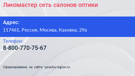 Линзмастер, сеть салонов оптики по адресу 117461, Россия, Москва, Каховка, 29а в дальнейшем Организация, размещена в следующих категориях: