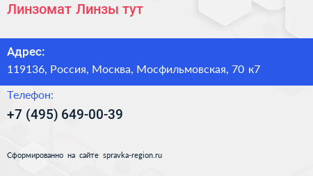 Линзомат Линзы-тут по адресу 119136, Россия, Москва, Мосфильмовская, 70 к7 в дальнейшем Организация, размещена в следующих категориях: