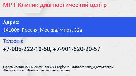 МРТ-Клиник, диагностический центр по адресу 141008, Россия, Москва, Мира, 32а в дальнейшем Организация, размещена в следующих категориях: