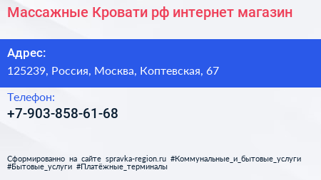 Массажные-Кровати.рф, интернет-магазин по адресу 125239, Россия, Москва, Коптевская, 67 в дальнейшем Организация, размещена в следующих категориях: