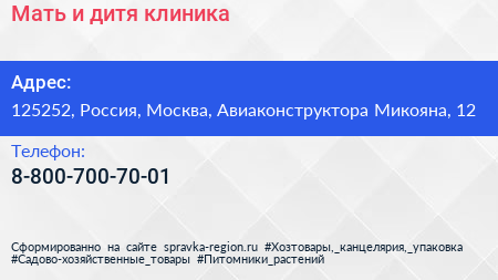 Мать и дитя, клиника по адресу 125252, Россия, Москва, Авиаконструктора Микояна, 12 в дальнейшем Организация, размещена в следующих категориях: