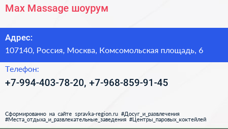 Max Massage, шоурум по адресу 107140, Россия, Москва, Комсомольская площадь, 6 в дальнейшем Организация, размещена в следующих категориях: