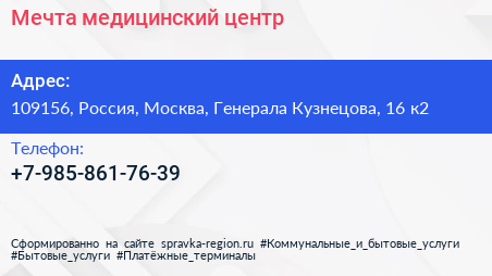 Мечта, медицинский центр по адресу 109156, Россия, Москва, Генерала Кузнецова, 16 к2 в дальнейшем Организация, размещена в следующих категориях: