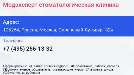 Медэксперт, стоматологическая клиника по адресу 105264, Россия, Москва, Сиреневый бульвар, 32а в дальнейшем Организация, размещена в следующих категориях: