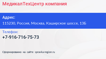 МедикалТехЦентр, компания по адресу 115230, Россия, Москва, Каширское шоссе, 13Б в дальнейшем Организация, размещена в следующих категориях: