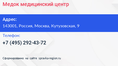 Медок, медицинский центр по адресу 143001, Россия, Москва, Кутузовская, 9 в дальнейшем Организация, размещена в следующих категориях: