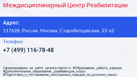 Междисциплинарный Центр Реабилитации по адресу 117628, Россия, Москва, Старобитцевская, 23 к2 в дальнейшем Организация, размещена в следующих категориях: