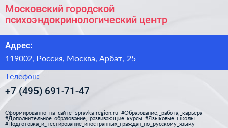 Московский городской психоэндокринологический центр по адресу 119002, Россия, Москва, Арбат, 25 в дальнейшем Организация, размещена в следующих категориях: