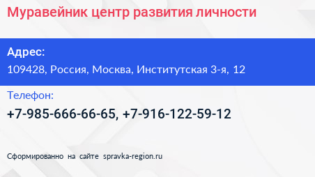 Муравейник, центр развития личности по адресу 109428, Россия, Москва, Институтская 3-я, 12 в дальнейшем Организация, размещена в следующих категориях: