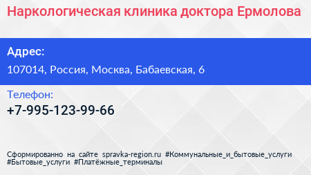 Наркологическая клиника доктора Ермолова по адресу 107014, Россия, Москва, Бабаевская, 6 в дальнейшем Организация, размещена в следующих категориях:
