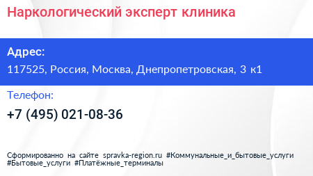 Наркологический эксперт, клиника по адресу 117525, Россия, Москва, Днепропетровская, 3 к1 в дальнейшем Организация, размещена в следующих категориях: