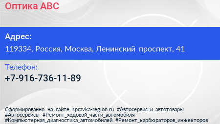 Оптика ABC по адресу 119334, Россия, Москва, Ленинский проспект, 41 в дальнейшем Организация, размещена в следующих категориях: