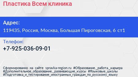 Пластика Всем, клиника по адресу 119435, Россия, Москва, Большая Пироговская, 6 ст1 в дальнейшем Организация, размещена в следующих категориях:
