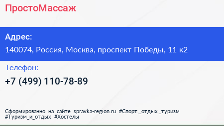 ПростоМассаж по адресу 140074, Россия, Москва, проспект Победы, 11 к2 в дальнейшем Организация, размещена в следующих категориях: