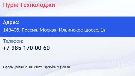 Пурж Технолоджи по адресу 143405, Россия, Москва, Ильинское шоссе, 1а в дальнейшем Организация, размещена в следующих категориях: