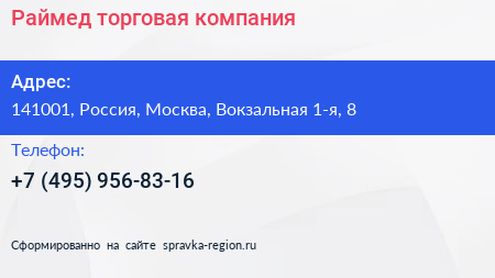 Раймед, торговая компания по адресу 141001, Россия, Москва, Вокзальная 1-я, 8 в дальнейшем Организация, размещена в следующих категориях: