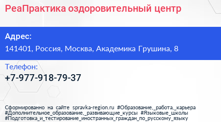 РеаПрактика, оздоровительный центр по адресу 141401, Россия, Москва, Академика Грушина, 8 в дальнейшем Организация, размещена в следующих категориях: