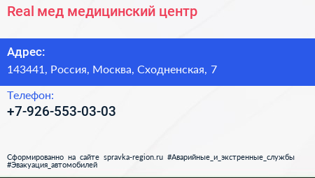Real мед, медицинский центр по адресу 143441, Россия, Москва, Сходненская, 7 в дальнейшем Организация, размещена в следующих категориях: