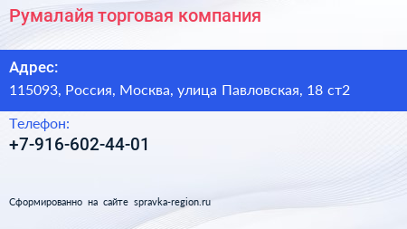 Румалайя, торговая компания по адресу 115093, Россия, Москва, улица Павловская, 18 ст2 в дальнейшем Организация, размещена в следующих категориях:
