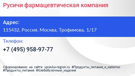 Русичи, фармацевтическая компания по адресу 115432, Россия, Москва, Трофимова, 1/17 в дальнейшем Организация, размещена в следующих категориях: