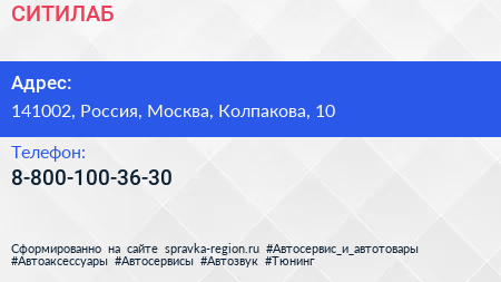 СИТИЛАБ по адресу 141002, Россия, Москва, Колпакова, 10 в дальнейшем Организация, размещена в следующих категориях:
