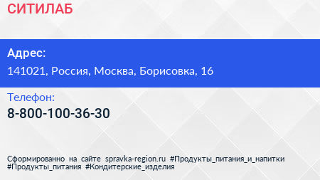 СИТИЛАБ по адресу 141021, Россия, Москва, Борисовка, 16 в дальнейшем Организация, размещена в следующих категориях: