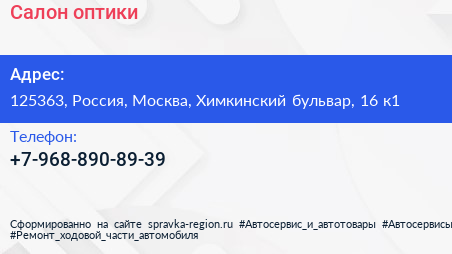 Салон оптики по адресу 125363, Россия, Москва, Химкинский бульвар, 16 к1 в дальнейшем Организация, размещена в следующих категориях: