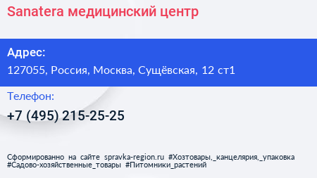 Sanatera, медицинский центр по адресу 127055, Россия, Москва, Сущёвская, 12 ст1 в дальнейшем Организация, размещена в следующих категориях: