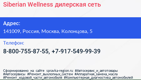 Siberian Wellness, дилерская сеть по адресу 141009, Россия, Москва, Колонцова, 5 в дальнейшем Организация, размещена в следующих категориях: