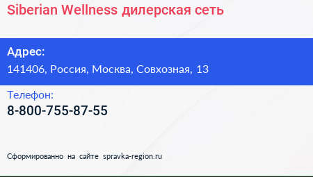 Siberian Wellness, дилерская сеть по адресу 141406, Россия, Москва, Совхозная, 13 в дальнейшем Организация, размещена в следующих категориях: